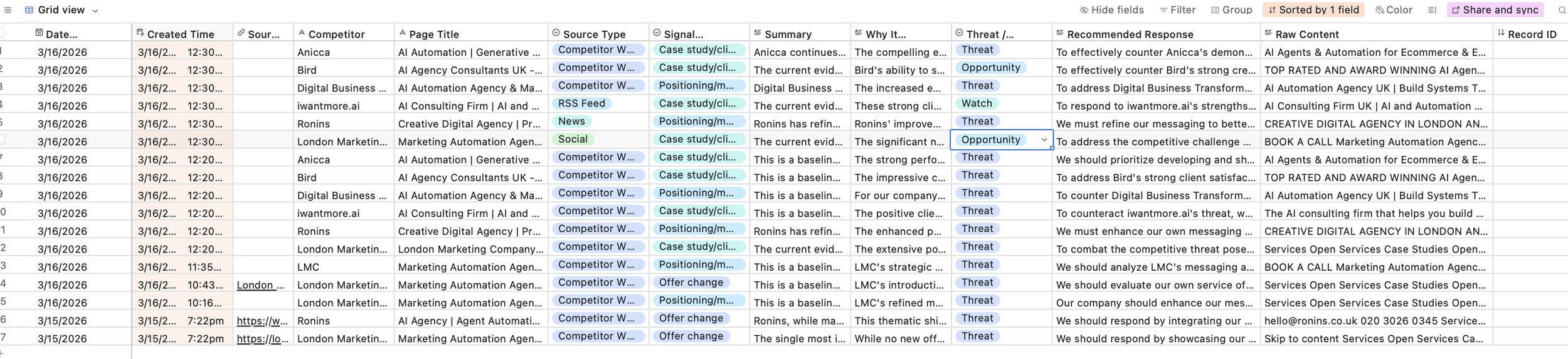 Structured competitor signals written into Airtable for ongoing tracking, comparison, and review.