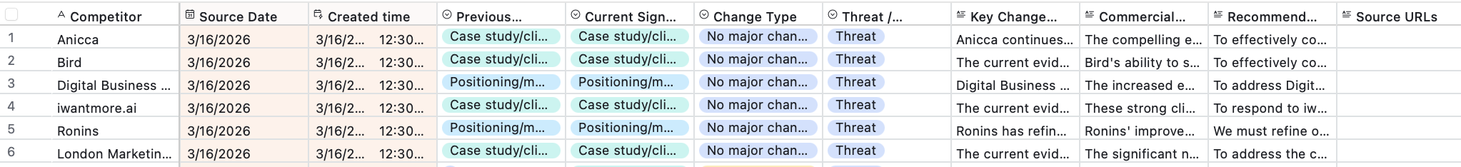The current workflow focuses on visible competitor signals from public sources. These include positioning and messaging, service and offer framing, case studies and proof points, client reviews, and broader trust signals. Each signal is analysed not just for what has changed, but for why it matters commercially. The output includes a clear summary, an assessment of the impact, and a recommended response.