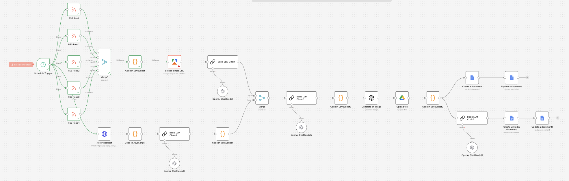 Most workflows follow a linear and superficial process. Content is pulled from RSS feeds or scraped sources, passed through a language model, turned into an article, and then distributed across platforms such as LinkedIn or a website. This creates the illusion of automation, but it lacks any real decision-making. There is no filtering of inputs, no prioritisation of signals, and no alignment to audience or customer journey. Every input is treated equally, which results in generic outputs that lack relevance and differentiation.